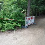 Nach einer telefonischen Alarmierung fuhren wir zum Parkplatz des Nepal-Tempels, wo uns der Besitzer schon erwartete um uns einen vom Eichenprozessionsspinner befallenen Baum zu zeigen. Da die zuständigen Stellen für die Beseitigung der gefährlichen Insekten am Wochenende nicht erreichbar sind, wurden wir beauftragt den befallenen Bereich um den Baum für die Besucher des Nepaltempels abzusichern und somit eine Gefährdung von Personen zu verhindern.